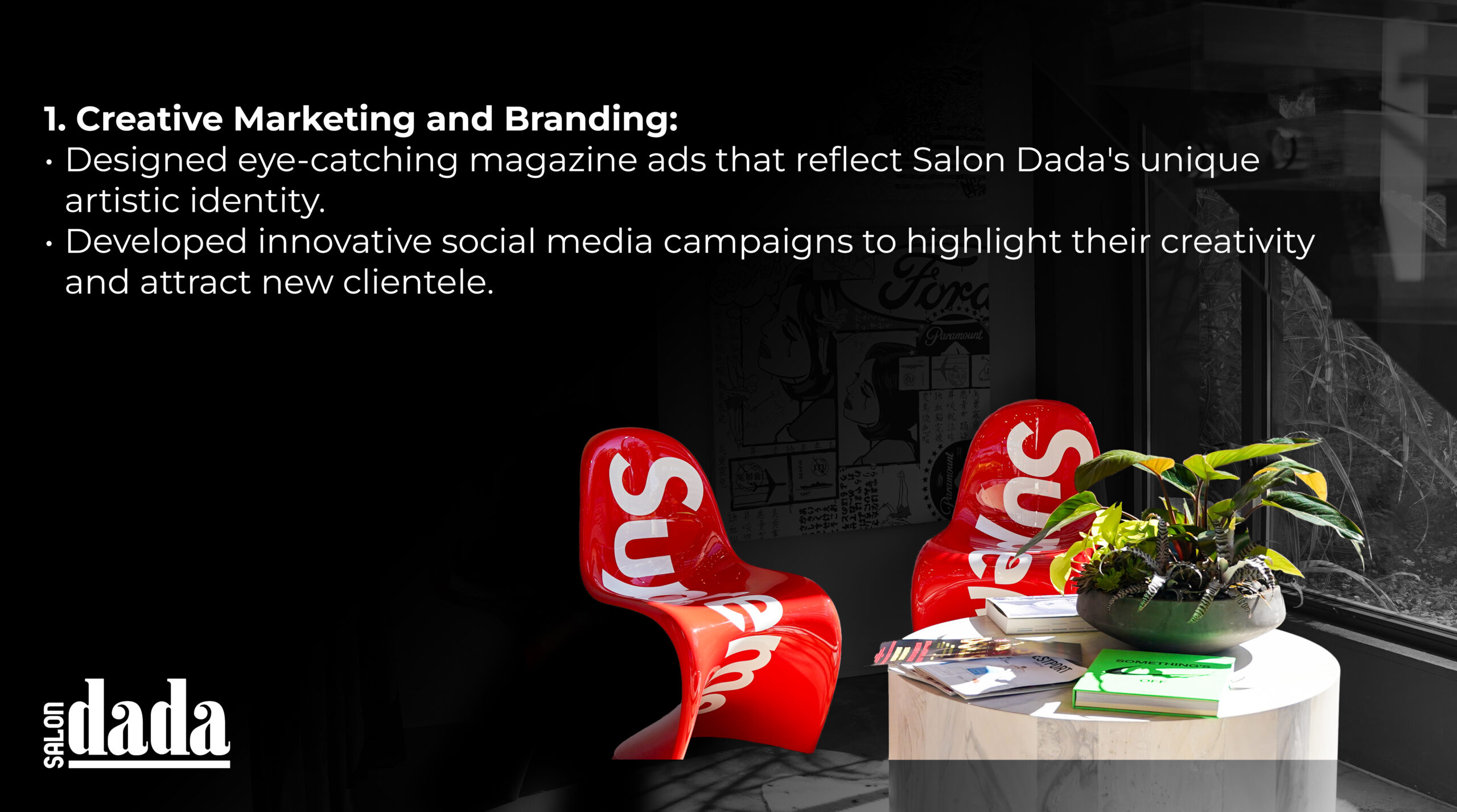 Through our collaboration, Salon Dada has become more than just a salon—it’s a community hub for creativity and artistic expression. From IT work to photography, videography, and marketing direction, we provide the tools and strategies needed to take their brand to the next level.